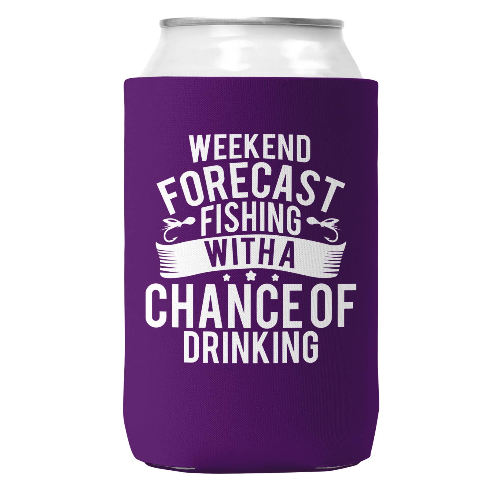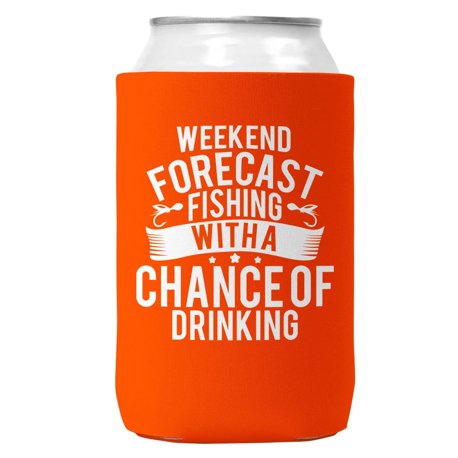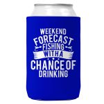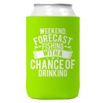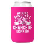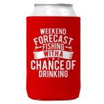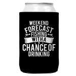 Weekend Forecast Fishing with a Chance of Drinking Can Koozie Cooler 12oz Cans. Screen printed on a quality collapsible neoprene can Koozie. Can coozie fits standard beer cans and soda cans. Comes with attached C hook to attach to peg or display. Weekend Forecast Fishing with a Chance of Drinking Koozie.